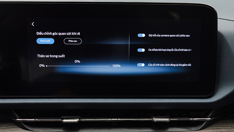 - Điều chỉnh độ hiển thị thân xe trong suốt: tùy chỉnh hình ảnh thân xe rõ nhất (0%) hoặc mờ (100%) chỉ thấy bốn lốp xe.